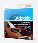 EFT16 is a light gauge set of strings for acoustic guitar, ideal for reduction of unwanted finger noise or for slide playing. Flat Top strings are precision ground, producing a smooth, flattened playing surface, without sacrificing tone and sustain associated with round wound Phosphor Bronze strings.
